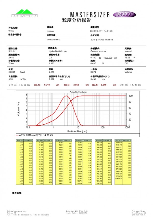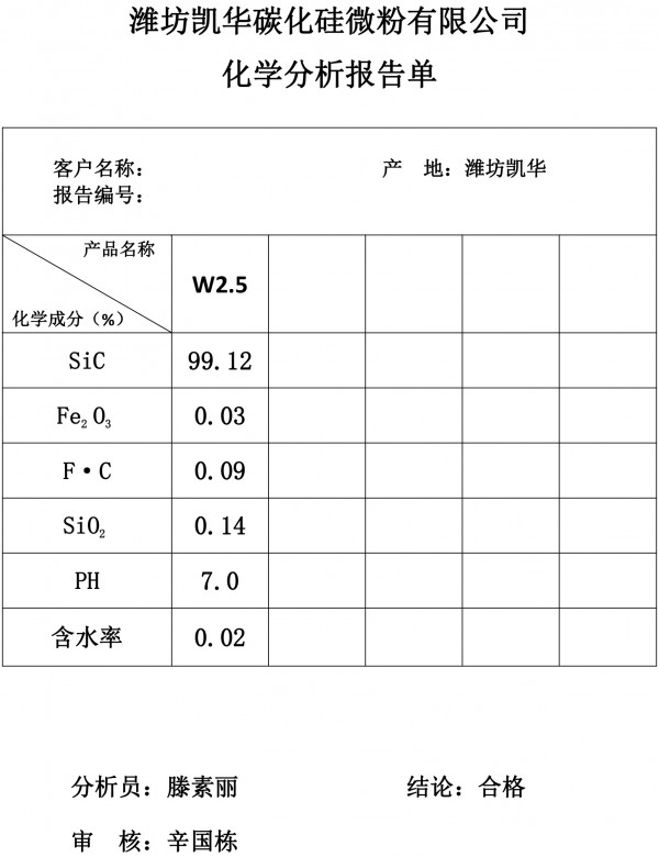 W2.5綠碳化硅微粉是選用優(yōu)質(zhì)大結(jié)晶碳化硅塊經(jīng)破碎、精密分級(jí)而成,品質(zhì)穩(wěn)定,結(jié)晶好,表面清潔度高,無大顆粒,細(xì)粒含量少,粒度分布集中,研磨效率高。